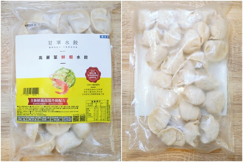 ▼「甘單高麗菜鮮蝦水餃」以透明袋裝,讓人可以清楚看見餃子的模樣,可惜沒有夾鏈設計,拆封後比較難以保存;正面貼有詳細介紹,清爽的配色看起來很舒服。「甘單水餃」有四大堅持,包括嚴選食材、用料透明,不使用餡成便宜絞肉;100天然蔬果提鮮,無雞粉、味精、甜味劑;無人工添加、不含防腐劑、磷酸鹽等;合理成本,關懷弱勢並回饋社會,不僅感受得到店家的用心,吃起來也更安心不少!