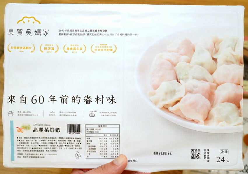 ▼「果貿吳媽家」發跡於1990年,一開始只是在左營果貿市場的小攤位,現在已經有自己的中央廚房,始終堅持新鮮、純手工的水餃,現在更是追求更高品質的餃子!高麗菜鮮蝦水餃採用盒裝,包裝走的是簡約文青風,上頭有詳細的產品資訊與烹調方式,也可以直接掃描QR Code查詢官網!