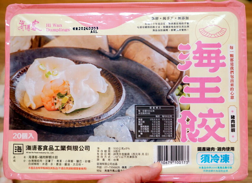 ▼「海濤客 豬肉鮮蝦水餃」採用粉嫩盒裝,方便保存又好拿取,可惜來的時候有點失溫,底部也有點沾黏;封面有詳細的產品介紹與營養標示,讓人一目了然。