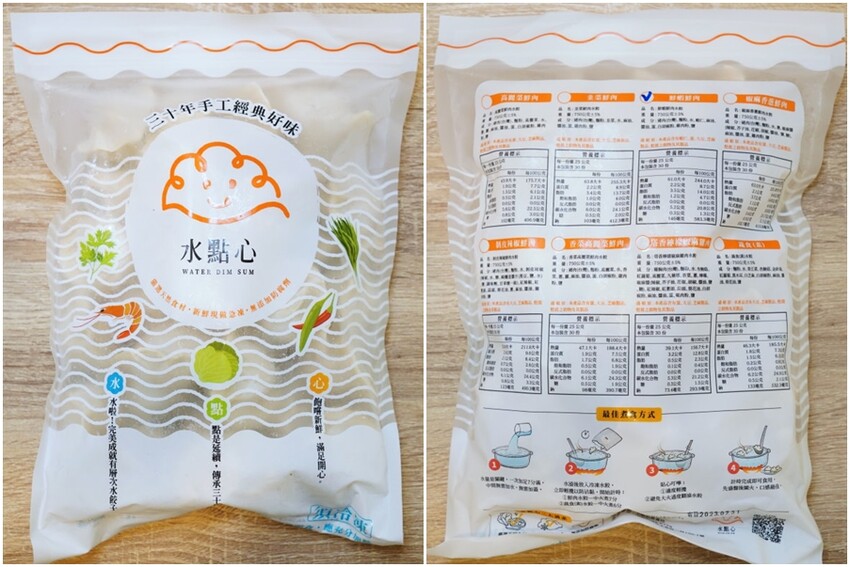 ▼「水點心 鮮蝦鮮肉水餃」採用夾鏈包裝,方便開啟也容易保存!正面以可愛的餃子LOGO加上食材,帶點童趣感滿討喜的,背面則是詳細產品資訊與烹煮方式,讓大家方便參考。