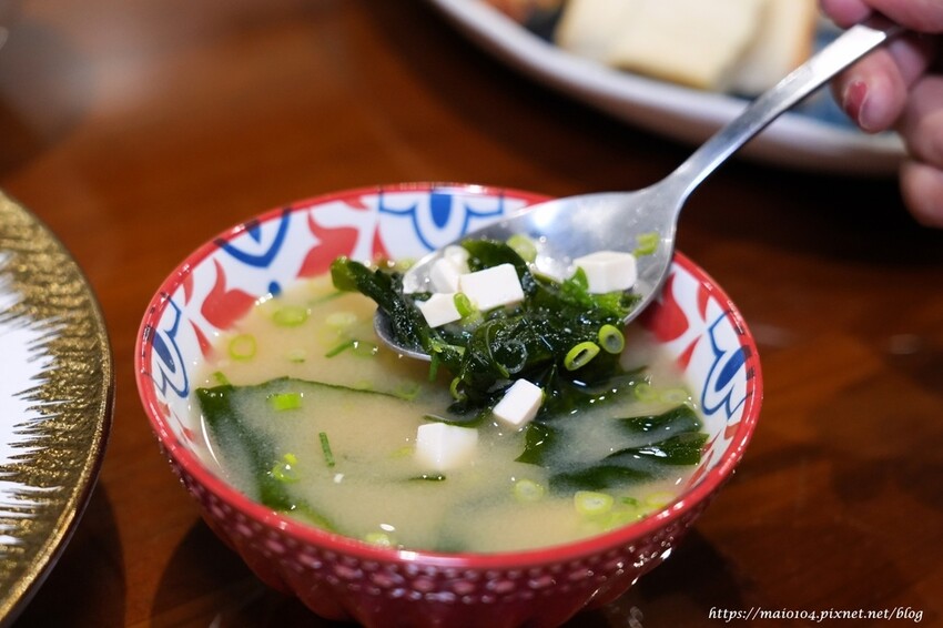 味噌湯裡面加入豆腐及海帶芽,有著味噌的鹹香還有滿滿蔥花的味道