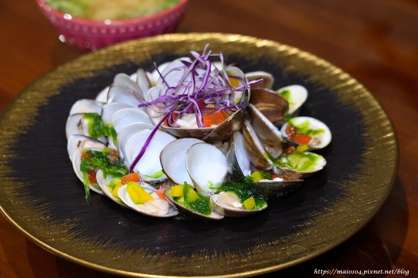 蛤蜊淋上生海苔勾芡的醬汁,更多了彩椒爽口的味道