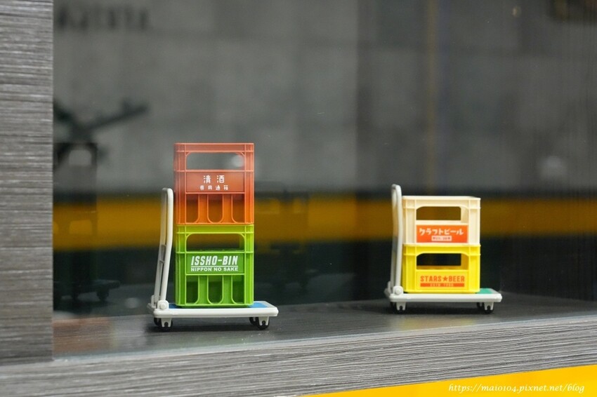 櫥窗裡擺放了許多小物,像是啤酒箱、車子模型等等