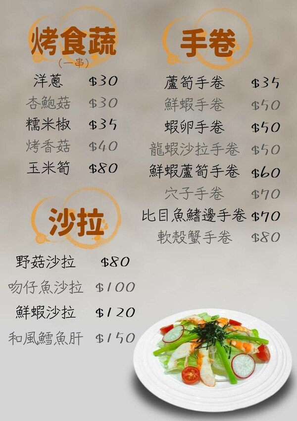 玩創意料理Yum&Fun菜單~烤食蔬、沙拉、手卷