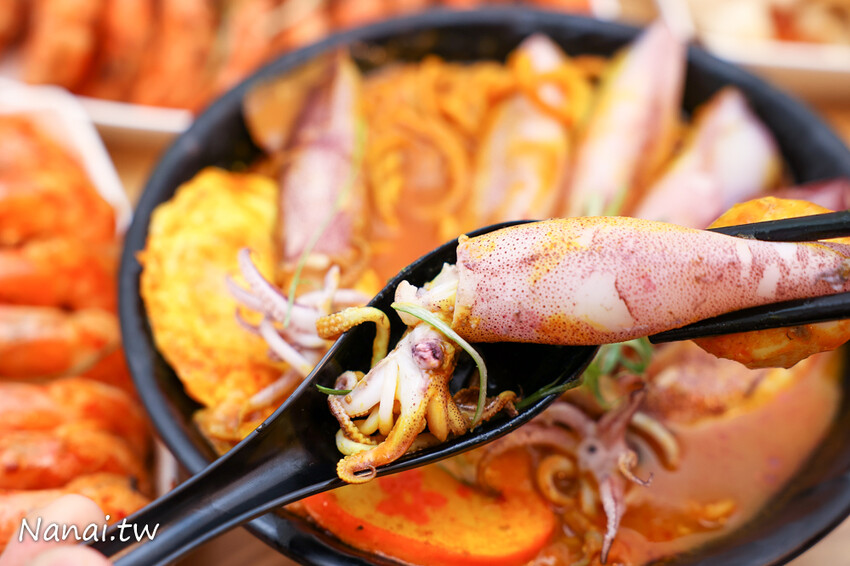 首先來試試小卷味道如何?小卷size竟然跟我手指一樣長,而且每隻肥美又渾厚,一口咬下享受那Q彈脆口的滋味,鮮味直接在嘴裡竄開,重點不會潤潤又難咬。鍋燒意麵和坊間吃到不一樣,麵條吸附著滿滿湯汁,吃起來不會太硬也不會太軟爛,口感彈牙又有Q性,吃到最後沒什麼油耗味,最後就是濟州咖哩湯,口感濃郁中帶有微辣感,NA真心推薦這道必點!