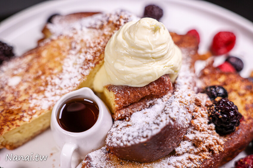 店家對食材製作皆十分用心,全手工製作,吐司選用法式布里歐麵包,用蛋液與牛奶泡軟,再裹上奶油下油鍋煎,煎的色澤嫩黃還帶微酥感,職人的堅持與精隨融入其中,盤子四周擺上黑莓、藍莓、覆盆莓妝點,再擺放蜂蜜焦糖醬與擠上動物性手作鹹奶油,再用咖啡焦糖餅乾增添層次,豐富又澎湃的用料,更蘊藏店家的用心。