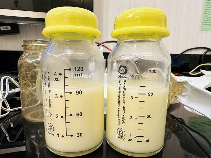 桌上放置四個空奶瓶擠完母奶寫好母乳卡綁上橡皮筋可送至嬰兒室窗口給護理人員以瓶換瓶方式