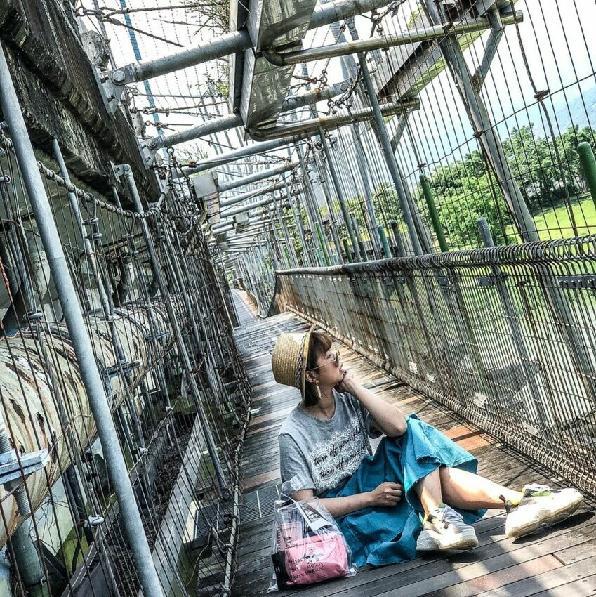 像極廢棄般的天空之橋,融合著工業風和奇幻風,充滿著藝術混搭感的場景,慶和橋津梅棧道位於宜蘭社福館旁,用鐵絲和水管編織而成的懸空棧道,立於河面之上,依附於慶和橋旁,立於棧道上,望著眼前的河水和綠色堤堰,享受著微風從河上吹拂而來,宜蘭三日遊必來這個一處世外桃源。