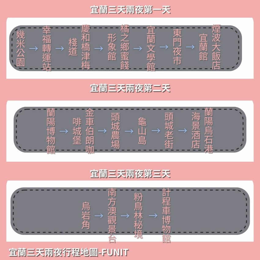 幾米公園→幸福轉運站→慶和橋津梅棧道→橘之鄉蜜餞形象館→宜蘭文學館→東門夜市→煙波大飯店宜蘭館