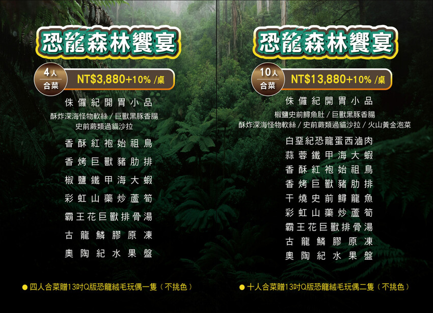 搭配恐龍探索森林2.0活動推出的恐龍森林饗宴有四人、十人餐兩種組合,