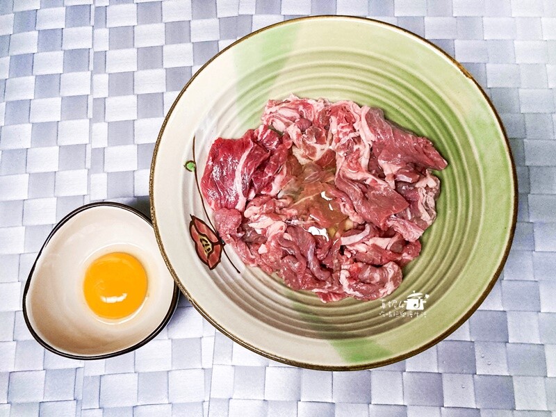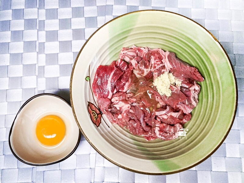大碗裡放入雪花牛肉片及蛋白抓醃後再加入雞粉抓拌均勻備用