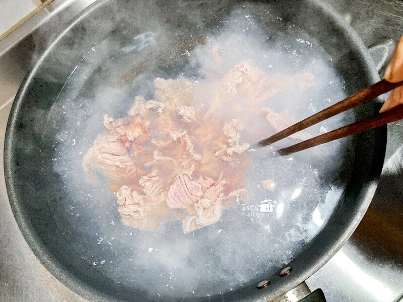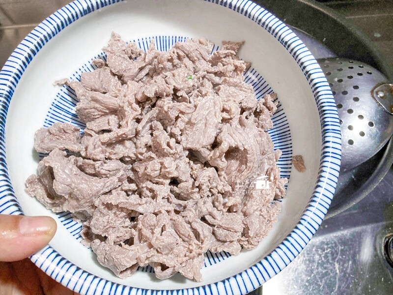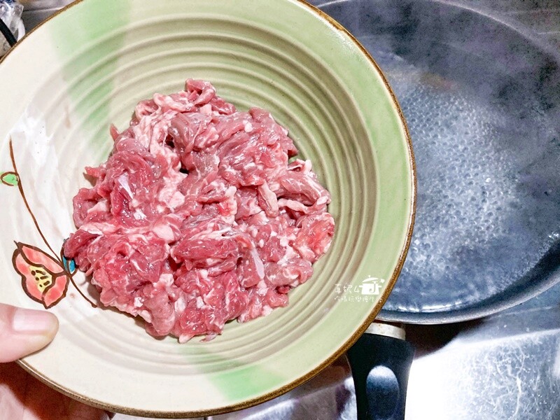 牛肉片薄容易熟,水滾後熄火再下鍋川燙,避免水溫升高把肉燙過頭