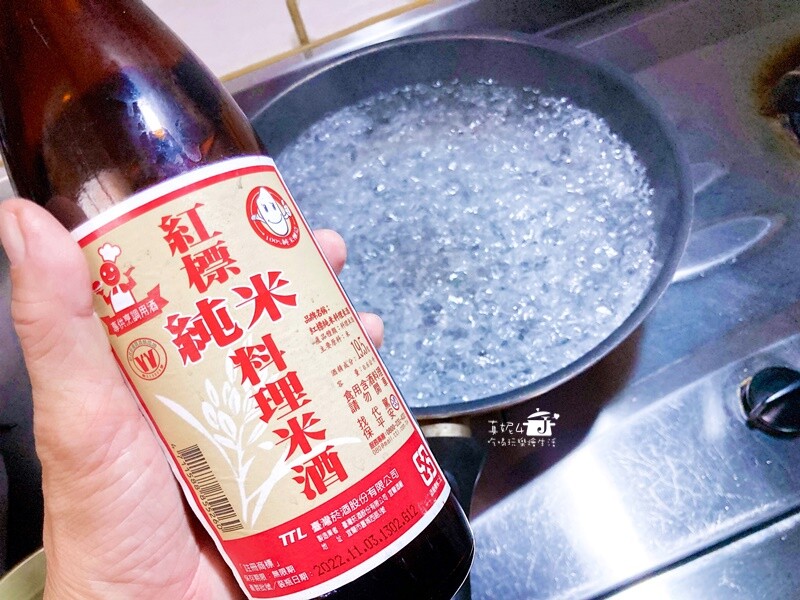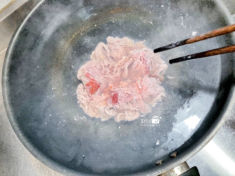 平底鍋放8分滿的水,燒開後加兩大勺米酒後熄火馬上放進牛肉片