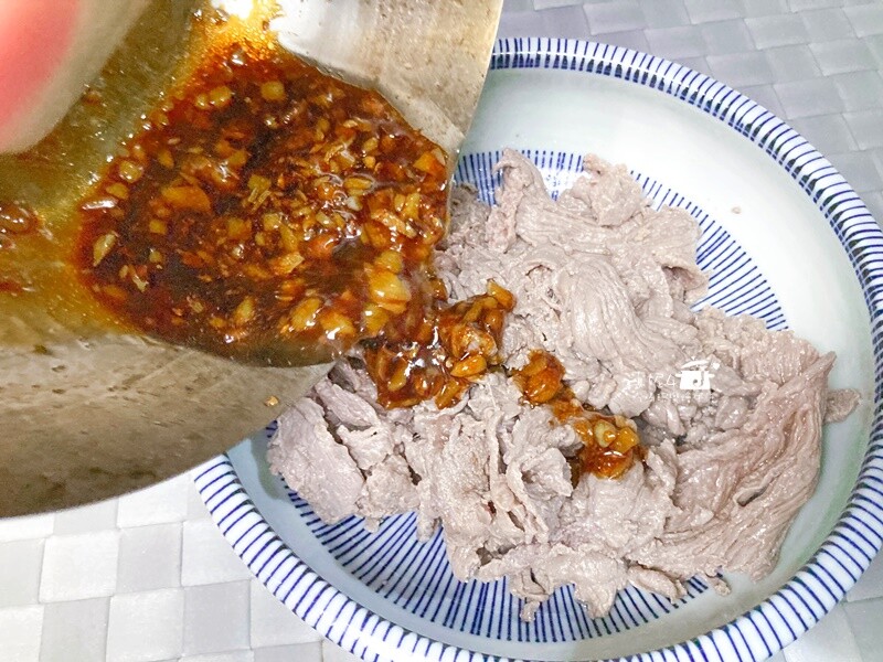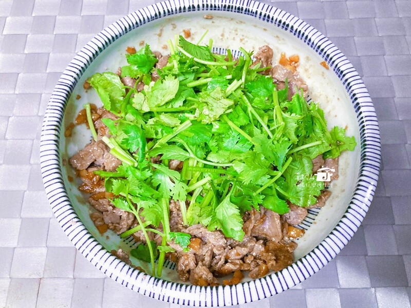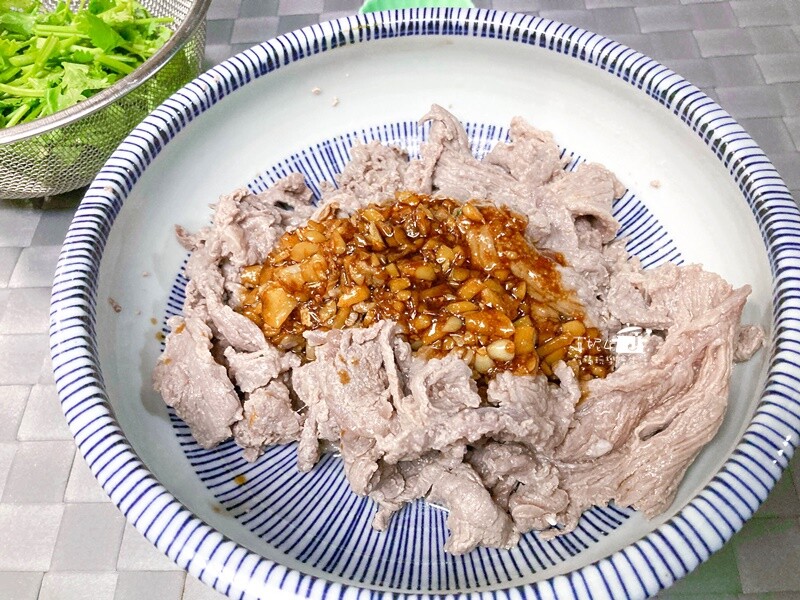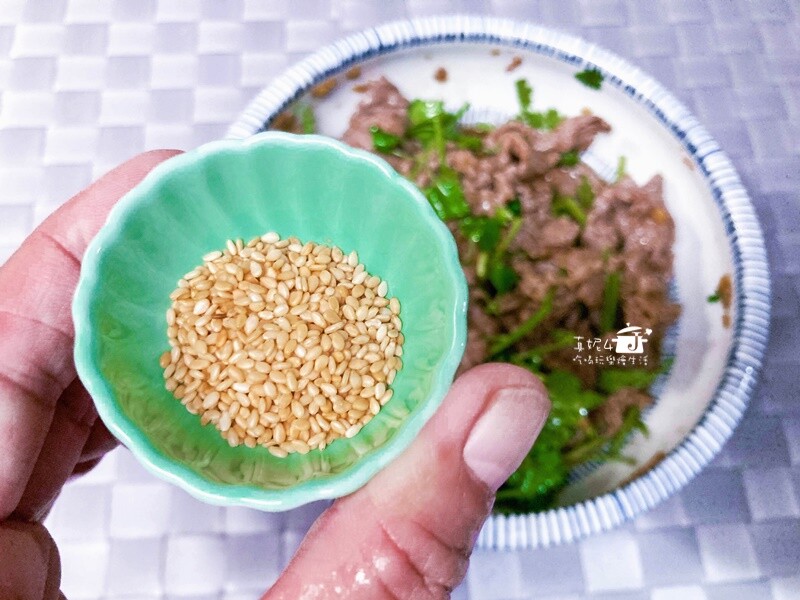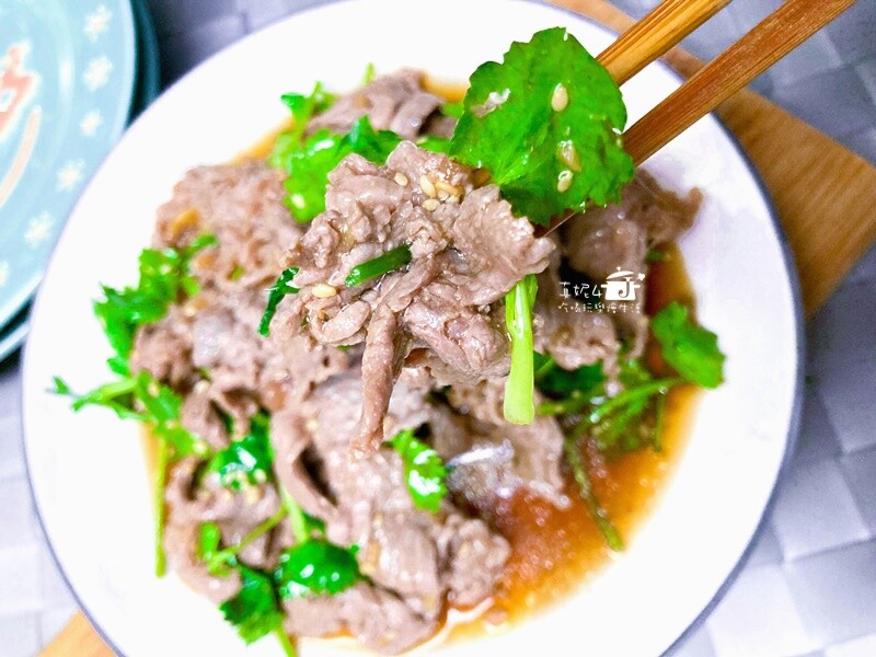 涼拌醬汁和牛肉片先混合吃味後再加入香菜混拌,上桌前再撒上白芝麻提香