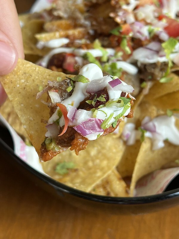 說到墨西哥料理怎麼能少了玉米脆片,上頭加上招牌的墨西哥肉醬,爽脆的玉米片吃起來卡滋卡滋,鋪上滿滿的墨式油封豬肉,口感相當豐富~