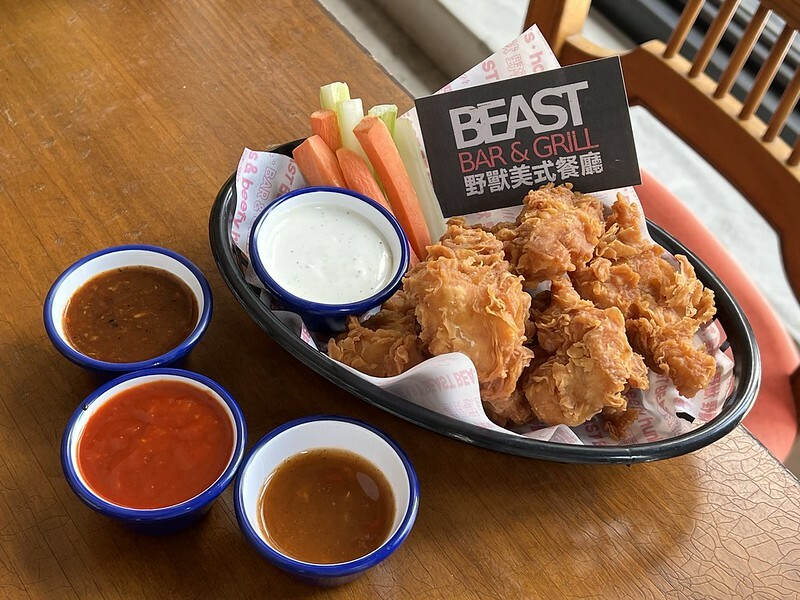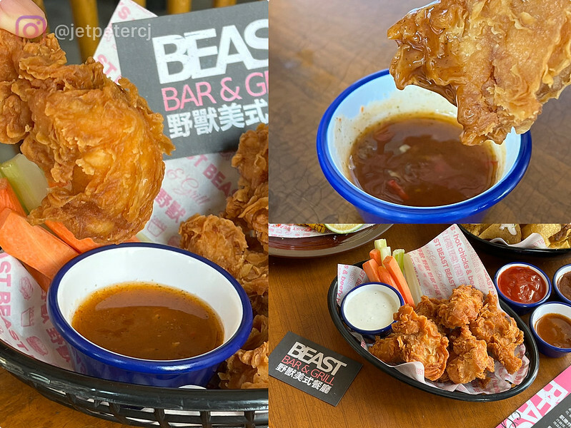 野獸美式餐廳不只墨西哥料理、漢堡超好吃~無骨炸雞更是一大招牌,雞肉吸滿獨特的醃料,搭配各種口味的醬料,再沾裹特殊沾醬,吃起來好罪惡,但真的好好吃喔~