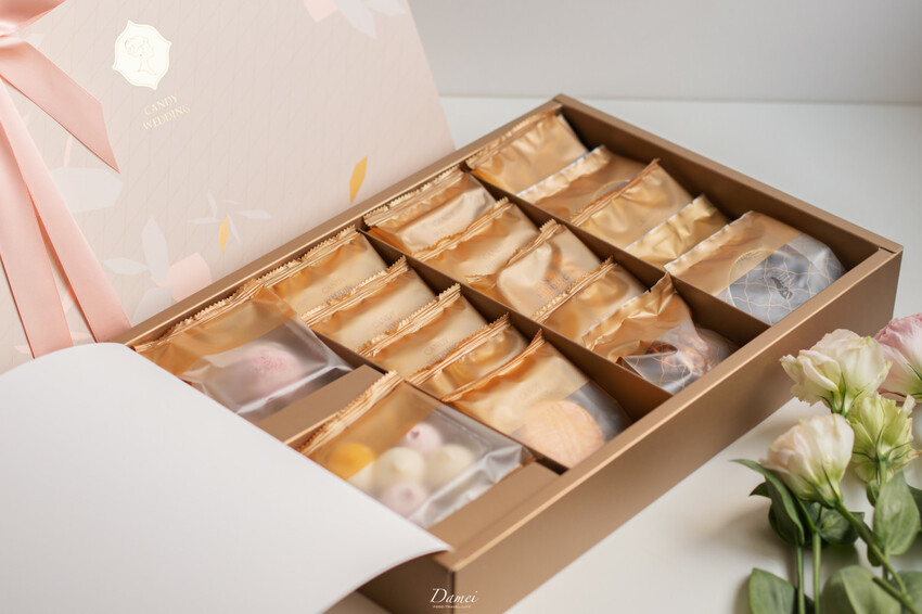 Candy Wedding這次推出的禮盒有12-13入與17-18入,可按自己的喜好做搭配,我個人偏好方形的盒子,也就是12-13入的容量,禮盒的設計像是飛舞的花瓣,優雅氣質又帶典雅感,是品牌向來給人的初印象呀。甚至在掀開禮盒的分層宛如翻書般的期待著裡面的小點心。