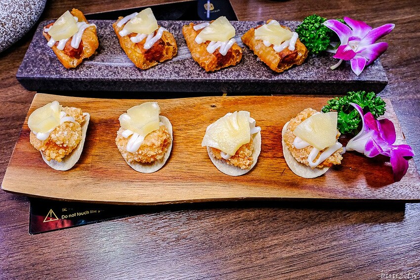 也可以考慮加點特色菜餚,像是這個月亮鳳梨蝦球,是把鳳梨蝦球改成結合洋芋片的吃法呈現。