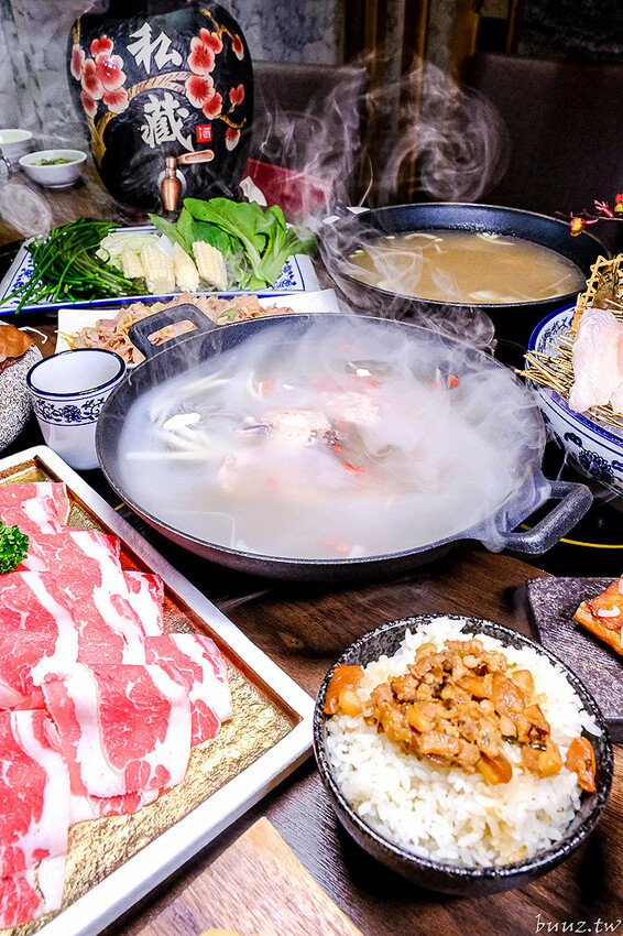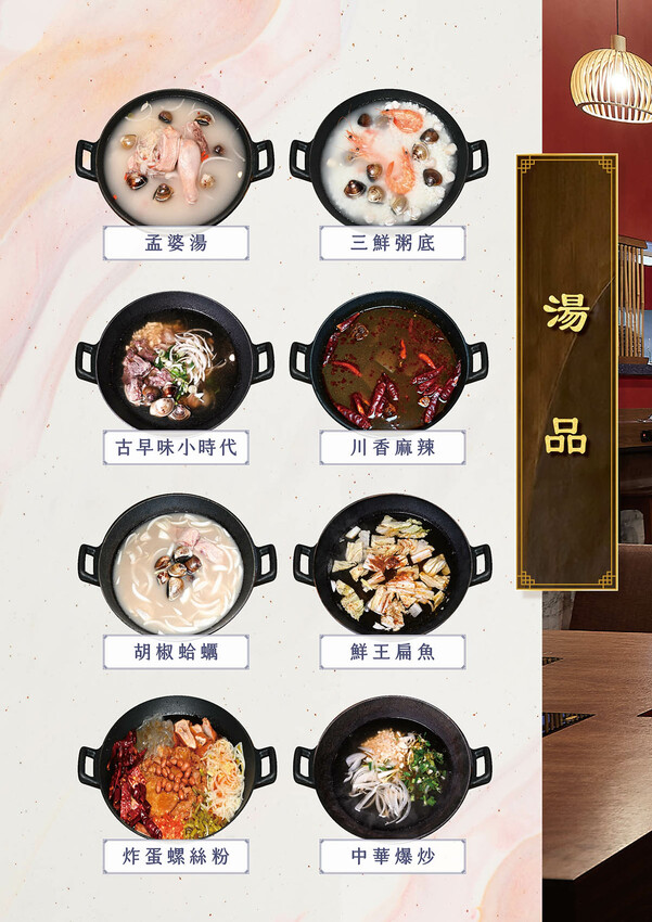 「禧珍家」新中式火鍋有八款特色湯品鍋底,像是古早味、胡椒蛤蠣、三鮮粥底、炸彈螺絲粉等都是比較少見的湯底,甚至還有充滿視覺效果的孟婆湯可以一嚐。