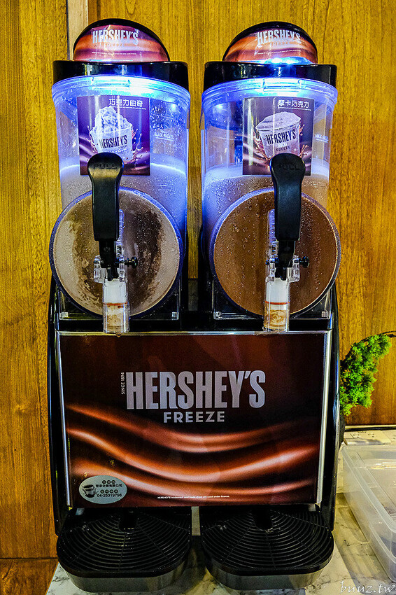 入口處旁邊則有擺放讓客人可以無限暢飲的冰沙及冰淇淋,冰沙有巧克力曲奇跟摩卡巧克力兩款口味,旁邊還有提供巧克力豆等配料可以點綴。