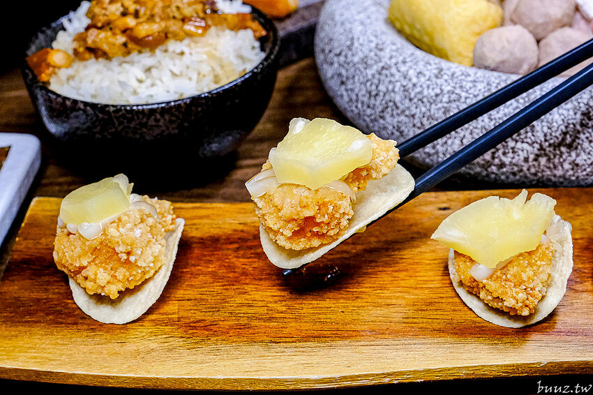 可以吃到現炸油條的酥脆口感配上中間扎實QQ的花枝漿,還有微微酸甜鳳梨片,可中和油條的膩口感,吃起來相當好吃有特色。