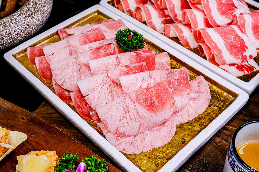 套餐內的肉盤是京品牛、京品豬各一盤,用金光閃閃的盤子送上,顯得很高貴有氣勢。