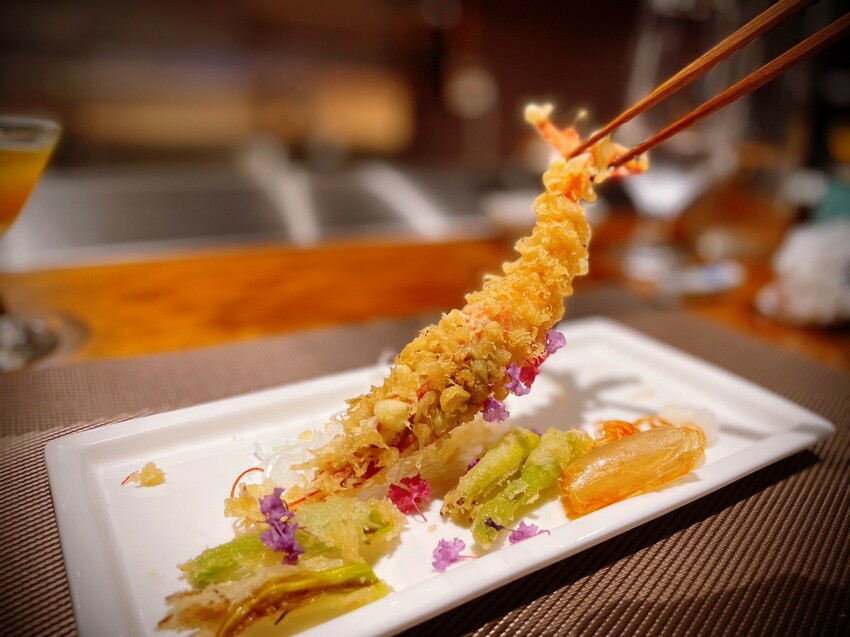 #生食級牡丹蝦:麵衣作舞薄脆沾,還有配菜金針花點綴天婦羅口感,是會讓人捧頰愣笑竟有如此美味的一絕。