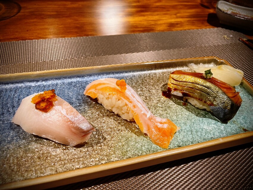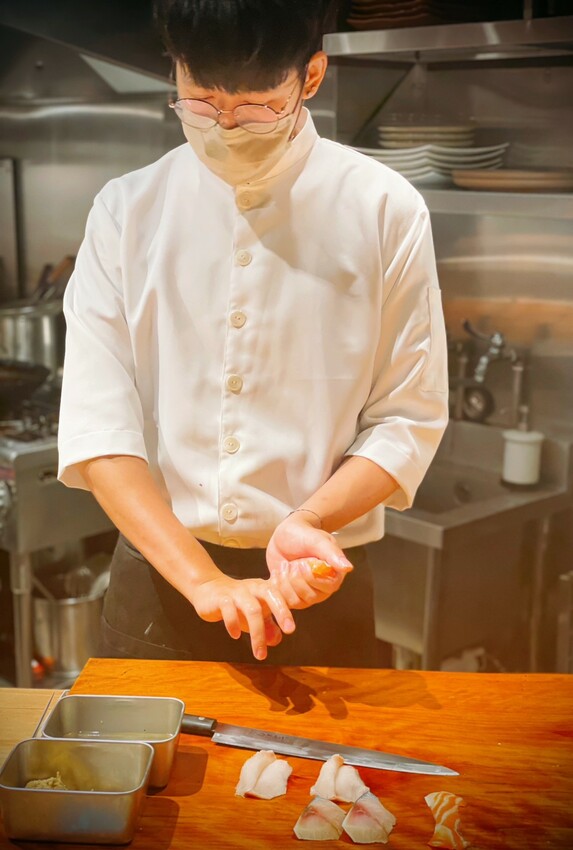 #板前握壽司:展現依各種魚體的特色割剖的華麗刀工,快速的「手返」動作炫目。嚴選當季最佳魚料,當天握壽司有三品,厚切新鮮肥美不在話下。