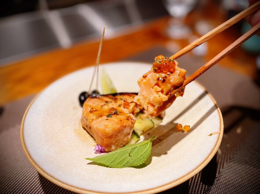 #炙燒生食級蜜汁鮭魚:猶如布丁又似嬰兒臉頰,嫩軟到入口時,瞬間化開一片輕柔雲彩。