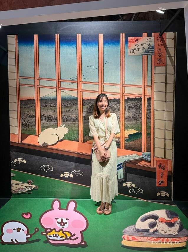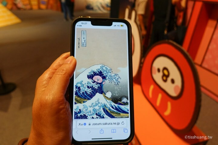 經典的浮世繪,這幅畫作《神奈川沖浪裏》是日本浮世繪畫家葛飾北齋創作的木刻版畫,該畫以富士山為背景,描繪了「神奈川沖」的巨浪掀卷著漁船,船工們爲了生存而努力抗爭的圖像,也看到粉紅兔兔、P兔化身為船工的可愛表情