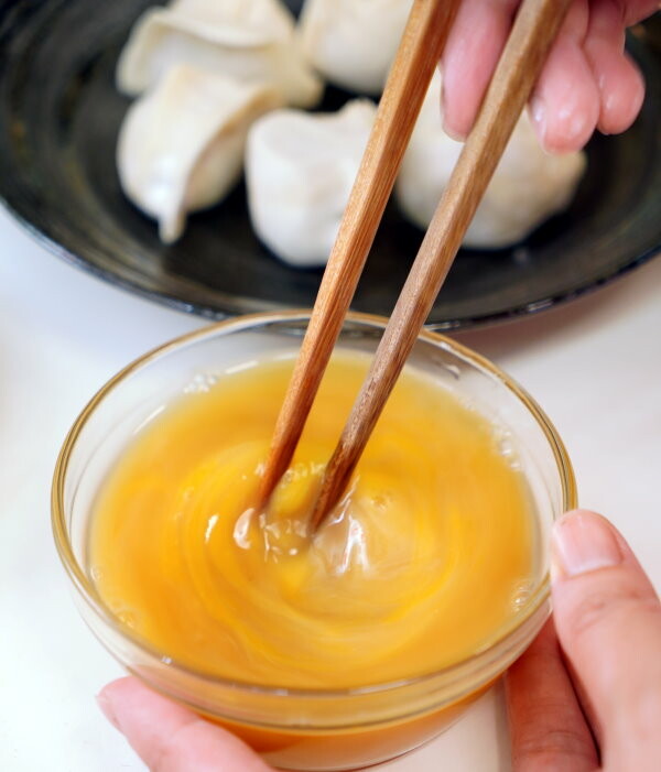 3.將100 ml高湯與10 ml鰹魚醬油、1顆雞蛋倒入容器中,攪拌均勻成蛋液。