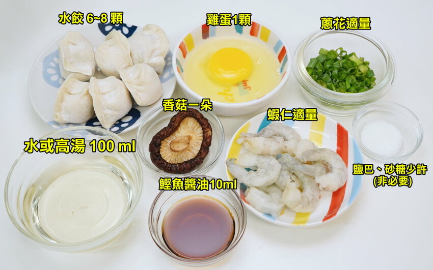 ▼鮮蝦蒸蛋水餃所需要的食材如下,其中高湯可以用昆布、香菇泡在水中,至少半小時即可,或者是前一晚先泡好放冰箱,風味更足;如果真的沒有高湯也可以用水代替~~味道也不會落差太大。