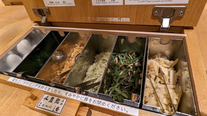 稻庭烏龍麵的特色就是細又滑又有彈性,很容易入喉。如果覺得麵沒有料吃起來有點少了什麼,請打開桌上的秘密機關,頓時出現海帶、牛蒡、昆布、天婦羅渣、溫泉蛋、山菜等六種配料,大方地隨便你加!