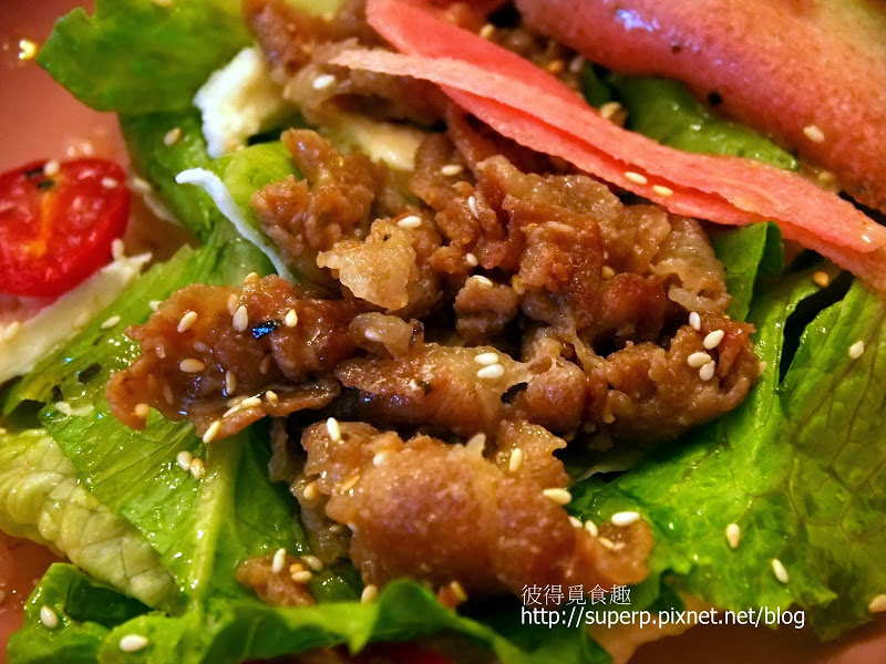 柚子燒肉沙拉佐紅心芭樂片(燒肉搭配生菜本來就不錯,加上紅心芭樂薄片就很特別了。增加了爽脆清甜的味道層次,非常好吃。風乾小番茄很甜。醬汁記得走有點鹹甜風格。旁邊還有類似撕成塊的Mozzarella起司,又給整體賦予了不同的口感。反正這道是大推!)