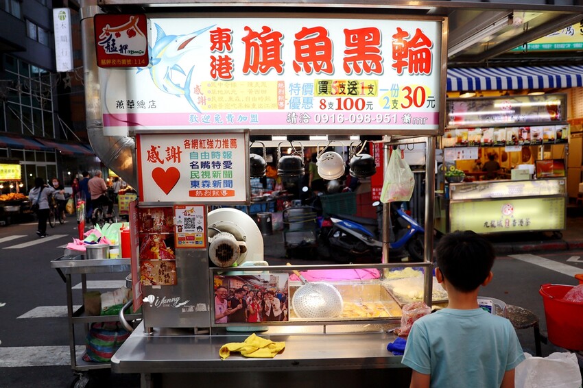 來到熱鬧的艋舺夜市,必吃排隊人氣王的艋舺夜市東港旗魚串,採旗魚漿並包了水煮蛋。2支30元的銅板價,依個人喜好加甜辣醬或芥末醬,是相當涮嘴的夜市熱門小吃。