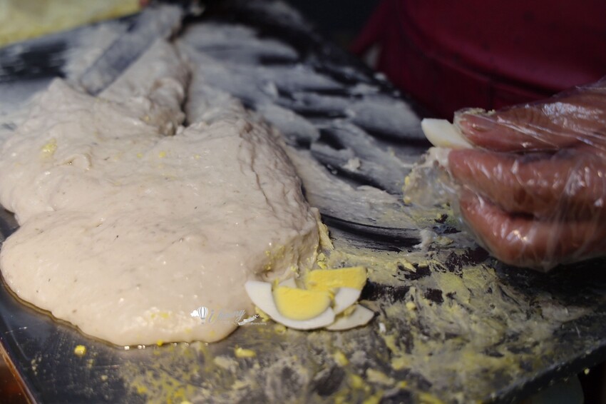 店家現場製作「東港旗魚黑輪」, 採用油脂少、肉質Q的旗魚肉,製作成魚漿。先將魚漿抹平後,內餡包入八分之一的水煮蛋再下油鍋炸熟!