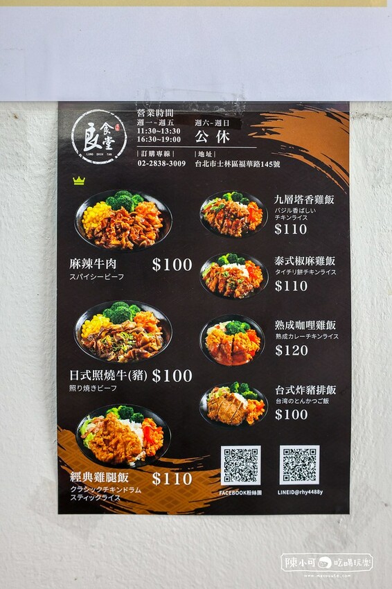 士林「良食堂」便當店地點就在捷運芝山站旁邊,會知道這間店名特別的便當是因為好幾個朋友陸續推薦,菜單提供台式炸豬排飯、泰式椒麻雞飯、九層塔香雞飯和麻辣牛肉飯等便當組合。