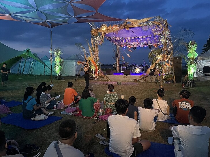 遊客輕鬆的坐在草地上,享受海風徐徐吹拂,欣賞樂團表演,迎接日落彩霞渲染大地,品味人生最快樂的時光。