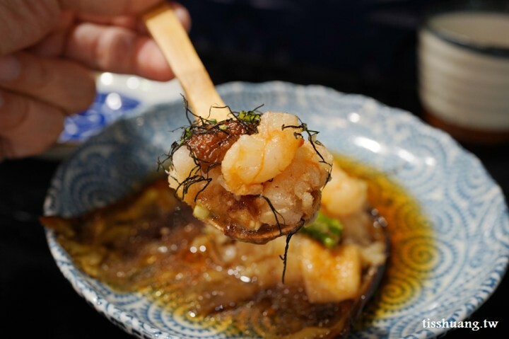 米茄寶船,這道料更是讓我佩服不已,因為瞳瞳平日是完全不吃茄子的人,竟然說好吃,這是因為師傅手藝了得以外,再來就是它用的食材也是日本進口的茄子,酥炸過後,再堆疊上炸蝦、炸香菇、炸山藥等食材,底部則是日式醬料,感覺就像一條船一樣,實在是太有創意了。