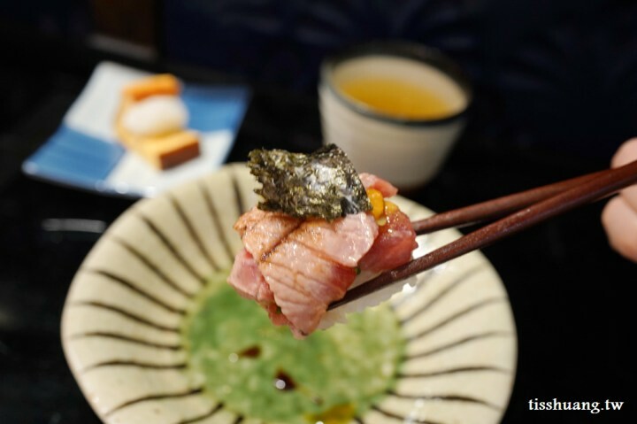 黑鮪魚大腹加海膽握壽司,這顆把壽司上面的炙燒黑鮪魚是用堆疊的方式層層蓋上去的,而且兩層黑鮪魚大腹中間還夾了海膽,兩種食材同時吃進嘴裡時同時化開,那種感覺真的是像來到天堂一樣,相信就連古代的帝王也沒有吃過這麼美味的食物吧!
