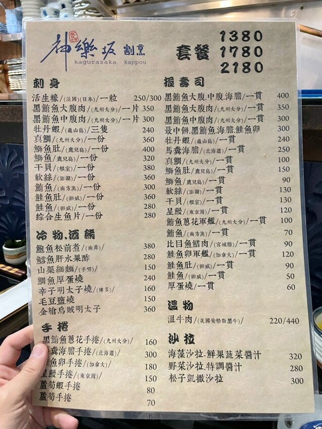 我們今天吃的是一份$2180的套餐,菜單上也有單點的價格,我覺得無菜單料理的價格最划算,而且有三種價位,另外兩種分別是$1380、$1780。