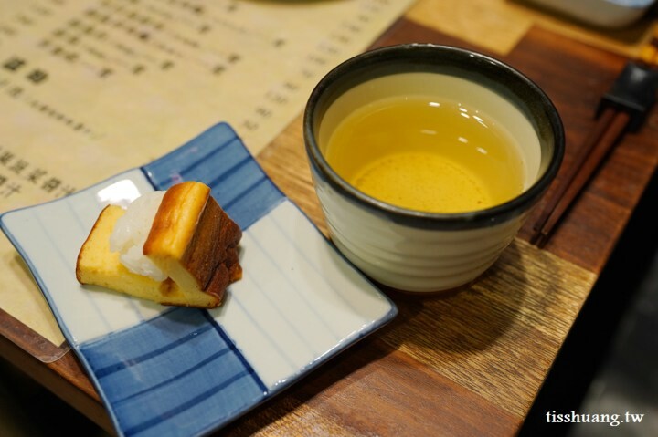 厚蛋燒,這道甜點是從日本玉子燒改良出來的,厚蛋燒的口感比較像是蛋糕,口感綿綿軟軟的,中間還夾了醋飯,這樣的組合真的是太特別了,同時也很大膽,一口茶,配一口厚蛋燒,真的超搭。