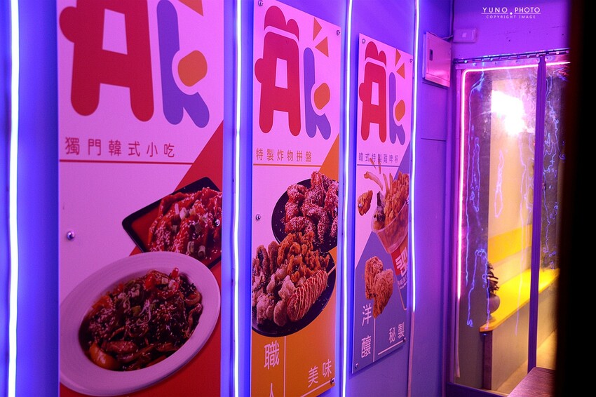 七彩的霓虹燈飾加上韓文的打卡牆真的是非常有時尚感