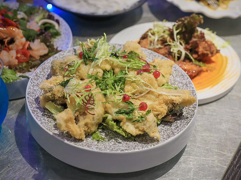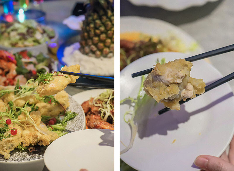 炸生蠔這麼大一顆真的很誇張!日本進口的生蠔裹上輕麵皮,從炸色就知道油質和炸的時間都有掌控,一口就是濃郁海味十足!鳳梨蝦球搭配的蝦子不只大顆而且鳳梨新鮮的水嫩在多些酸感,淋上主廚特調醬,酸甜之餘還多了一點鹹更為解膩開胃,