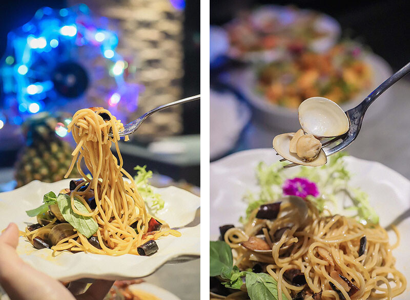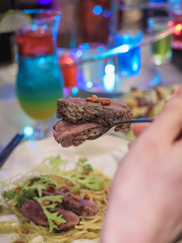 主食除了鳳梨炒飯,今天嚐到的兩款義大利麵也都是技術本位!細麵條的口感相當紮實,醬料的包裹均勻不膩口;蛤蜊意大利麵稍稍有點辣,不過卻是讓我們一口接一口;牛排意大利麵用的是菲力牛排,軟嫩剛好熟度適中,搭配的青醬口感不過濃膩,搭配著一顆顆松子很是提味。