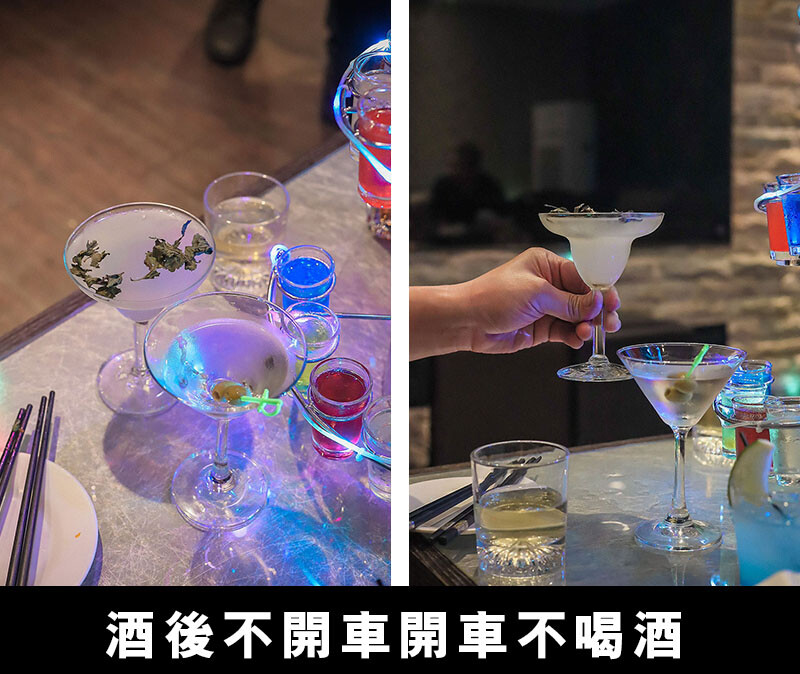 Dry馬丁尼是伏特加和苦艾酒以不同比例的調酒,年輕的時候還有去研究一下Dry、Dirty和Vesper Martini差在哪裡 XD 又是一個年輕的歲月;另一杯有茶葉漂浮的是茶酒,用RUM/蘭姆酒為基底,Bartender介紹是用茶葉現泡茶湯冷卻後加入,等我下次準備好可以喝的時候再來試試看~~