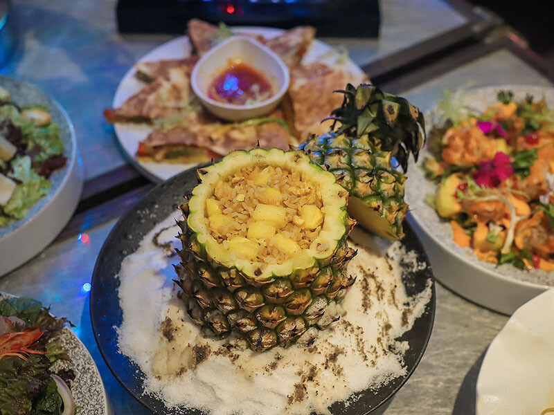 大家最有興趣的就是這一道了啦!光是一顆鳳梨頭上桌也很有趣,旁邊會附上一小杯生命之水+白蘭地,淋上後點燃讓火焰燒去酒精留下酒香,不要不相信,鳳梨炒飯融入酒香味道整個昇華起來,除了鳳梨還有蝦仁,不僅美味還兼顧夜店虛華的視覺效果!筆記了沒~必點啦!