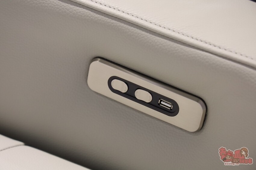 側邊設計可移動的單邊電動座椅,按鈕就隱藏在手把處,一旁還有附USB充電,來看看心愛a將電動沙發設定成喜歡的模式,或坐或躺都沒問題呢~