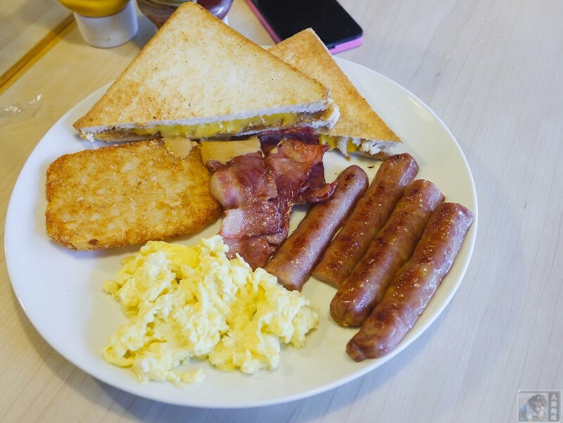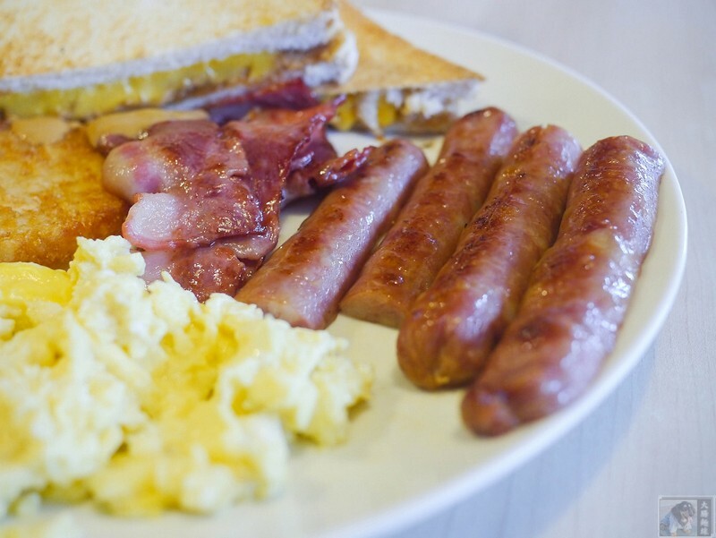 花生醬乳酪烤土司、特製香腸、培根、薯餅、炒蛋(無調味)