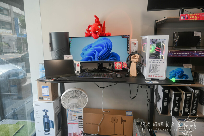 他們家的產品真的很多樣化,主機、螢幕先不說,滑鼠、鍵盤也是一定要的,然後發現他們還有升降桌,多款的電競椅可供試坐,其他家電類,掃地機、清淨機、運動攝影機,應有盡有呢!